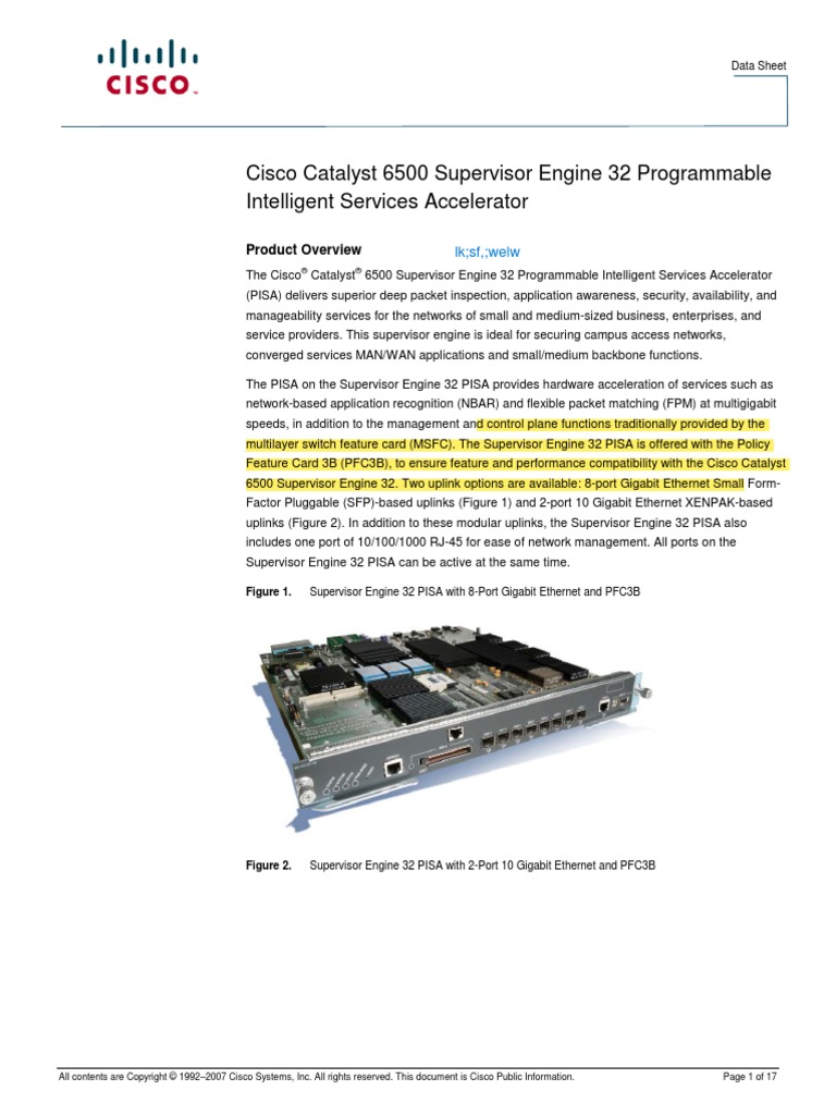 6500 Supervisor Engine 32 Pisa Data Sheet - With support for up to 32k acl entries, ip/ipx security acls in hardware, and advanced features such as port security, the catalyst 6500. Find detailed information on cisco catalyst 6500 2, 32, 32 pisa, 720, 2t, 6t supervisor engines. Cisco systems ® introduces the cisco ® catalyst ® 6500 series supervisor engine 32, the next generation of supervisor engine for the cisco. Secure application intelligence and integrated security: This document provides a comprehensive guide on. Pisa advantage application intelligence and integrated security is delivered using the.