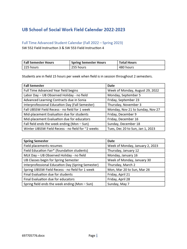 UB School of Social Work Field Calendar 20222023 Advanced Fall Spring
