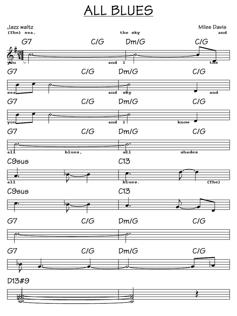G7 c7 g7 d7 9 e 7 9 d7 139 g7 1 all blues miles davis. Download and print all blues (arr. Sheet music giant is a site for those who wants to access popular sheet music easily,. ∑ the some sea blues g7 the are sky sad and. Free sheet music for amateur musicians and learners!