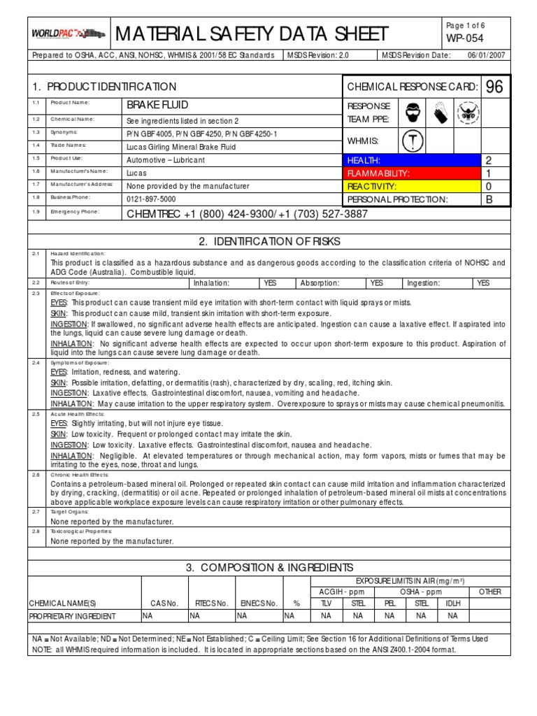 Safety data sheet wagner™dot 3 hydraulic brake fluid revised: Obtain special instructions before use. For specific application advice see appropriate technical data sheet or consult our company representative. Do not handle until all safety precautions have. Safety data sheet product name: