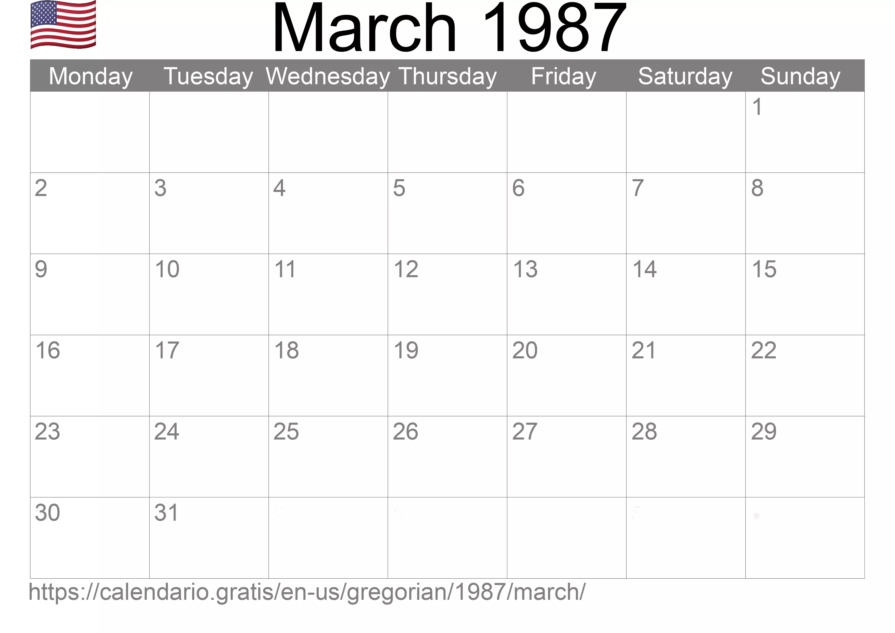 Print from the web or download. You can create online monthly calendar march 1987 with holidays. Just click print right from your browser. Download printable march 1987 calendar. What day is it and what does it mean?