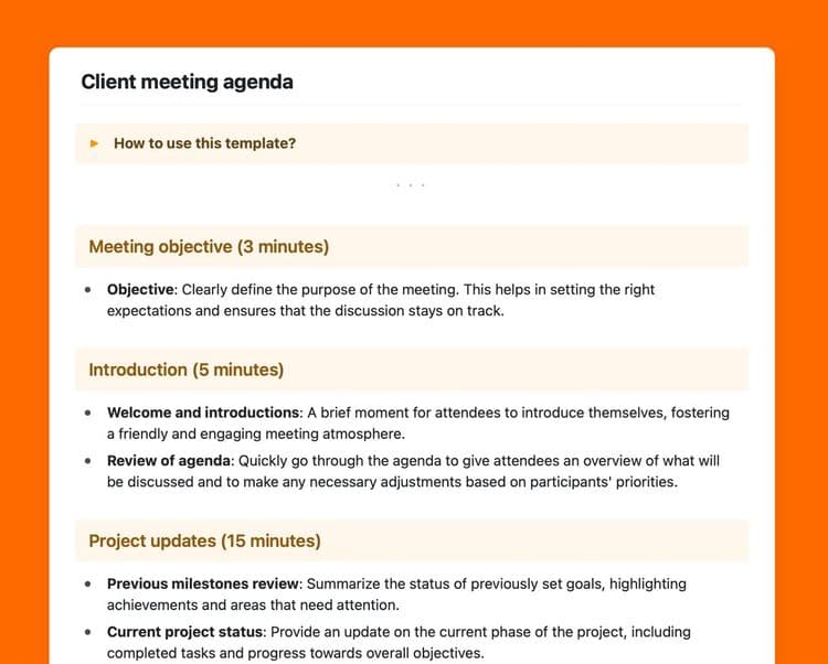 A client meeting agenda is a list of activities and topic discussions during a session with a customer or a client. In this article, we’ll explore several efficient meeting agenda examples that cater to various types of meetings.