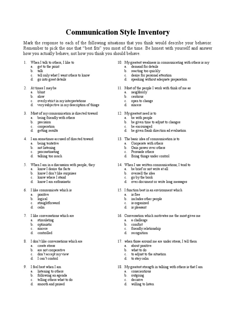What communication style are you? Since you are probably unaware of this, this questionnaire will help you pinpoint the experiences that suit your communication. Consider each of the following questions separately and circle the one letter (a, b, c, or d) that corresponds to the description that best. Afterwards read about the different styles and reflect on how you can..