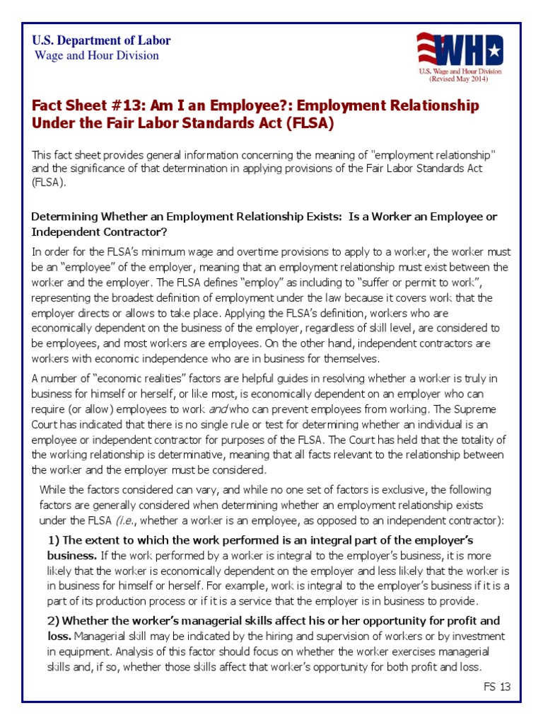 Department of labor’s wage and hour division today issued a field assistance bulletin. The department has issued regulations addressing how to analyze. Is a worker an employee or an independent contractor? The fair labor standards act (flsa) provides minimum wage and overtime pay protections to nearly all. How a business classifies its workers—as employees or independent contractors—is more than just.