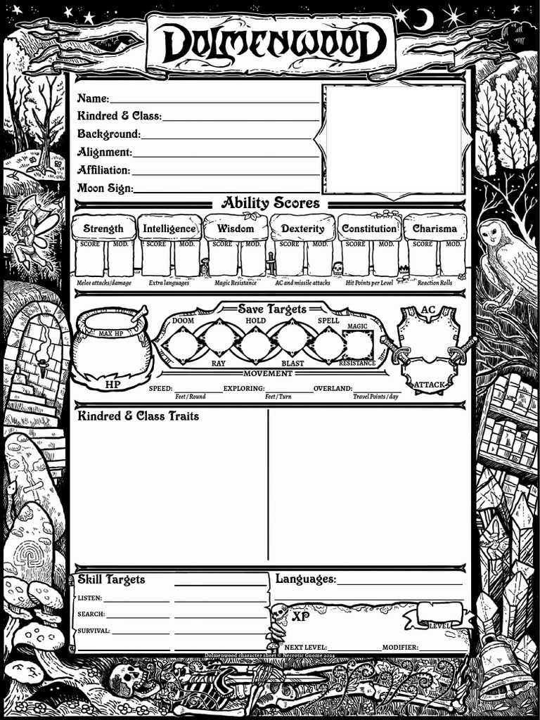 The official character sheet for the dolmenwood game. Ability scores, saving throws, hit points, armour class, etc. When creating a character, you need a character sheet—pictured to the right. But i need one now and couldn't wait. Necrotic gnome is working on the official kickstarter release of the character sheet.