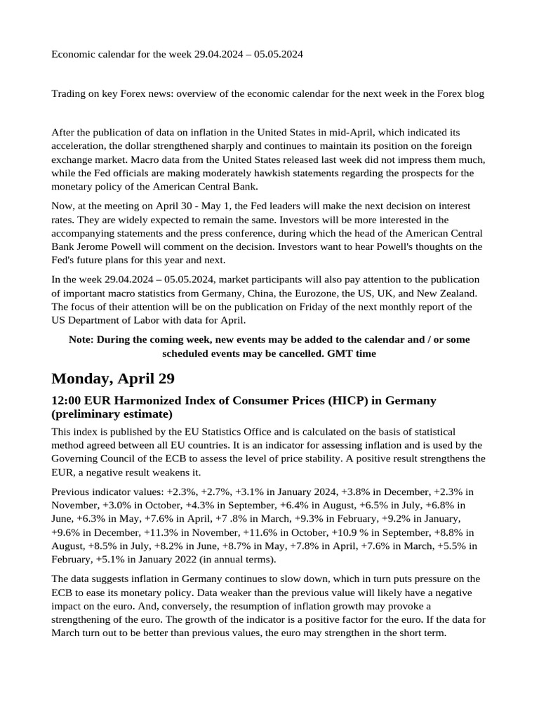 Economic calendar for the week 29.04.2024 05.05.2024 PDF Euro