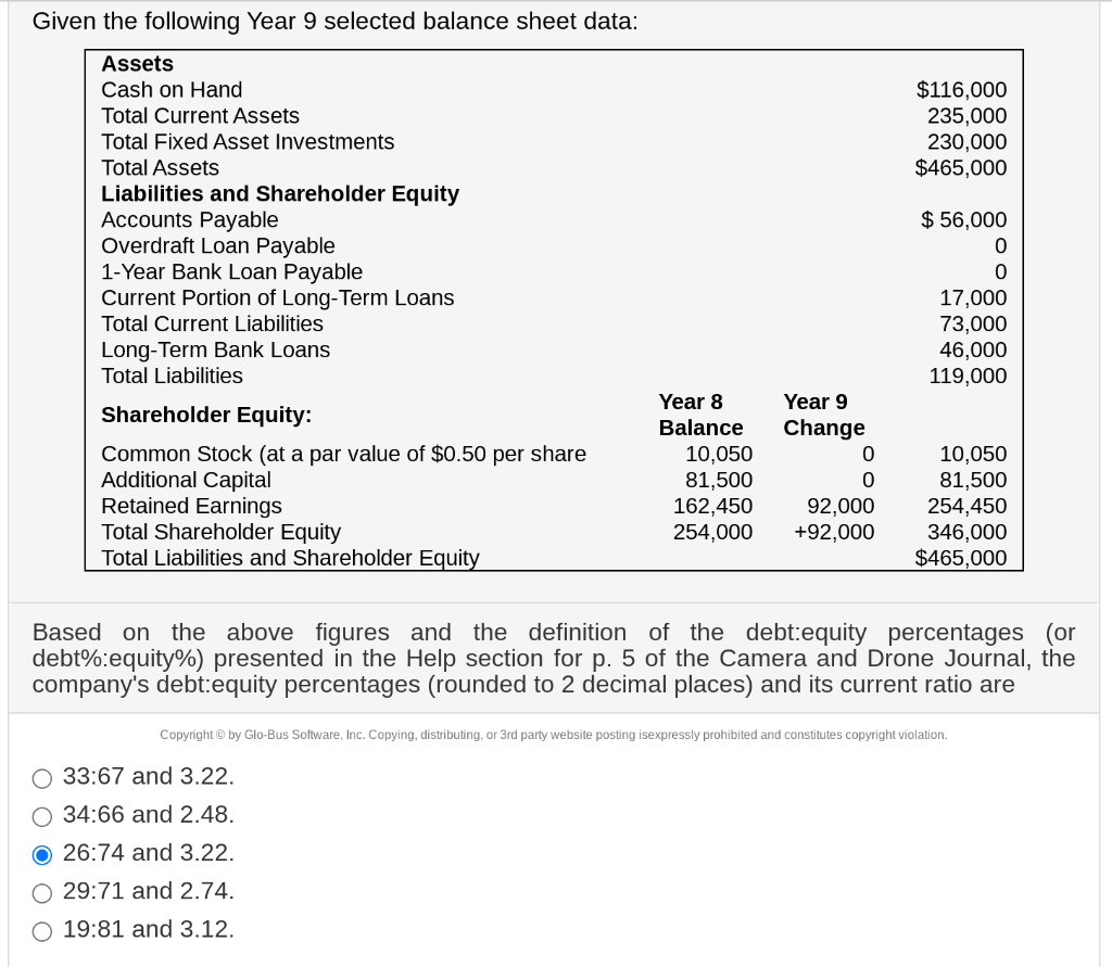 Given The Following Year 9 Selected Balance Sheet Data - In this solution, we are asked to compute for the company's debt to equity ratio and current ratio using the given information. One indicator of a company's financial leverage is its debt proportion. The data provided does not directly give us this figure, but we can infer it from the balance sheet data. It is computed by dividing the entire liabilities of the business by the total. There are 2 steps to solve this one. Total liabilities are the sum of current.