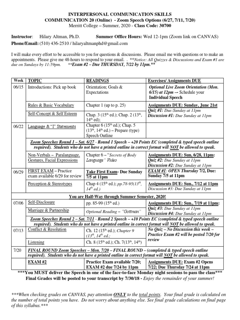 Merritt College Summer, 2020 Class Code 30700 Due On Sundays by