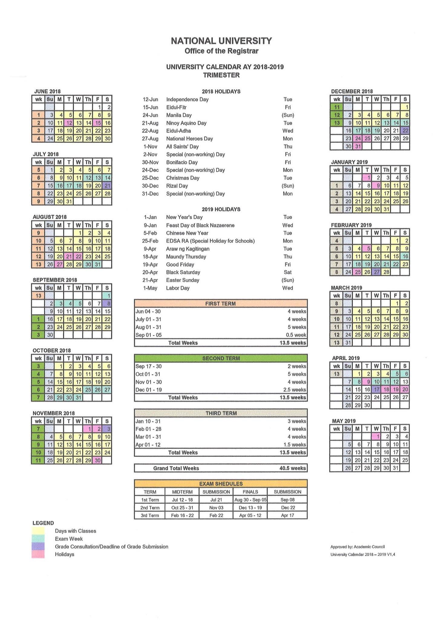 Take the first step in your national university journey. Attached is the national university calendar for 2023. Find your path & apply today. Time off at national university the available types of time off chart provides a brief overview of each type of time off the university. June 2024 10 11 july 2024 14 15 16 17 18 19 20 28 29 30 31 august 2024 september 2024 october 2024 12 20 21 22 23 24 25 26 13 27 28 29 30 31. National university is an accredited leader in over 190 flexible online bachelor's and graduate degree programs. There are currently no events. Please refer to the student portal for specific meeting times.