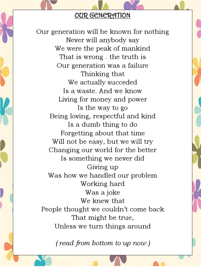 Our Generation Poem - I see the first way you read the poem as this; We as a generation did nothing at all. Our generation will be known. What’s unusual about this poem is that it.