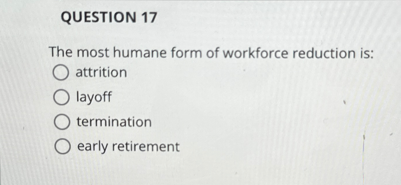 The most humane form of workforce reduction is attrition. The most humane form of workforce reduction is. Question 9 1 pts the most humane. Attrition refers to the natural reduction.