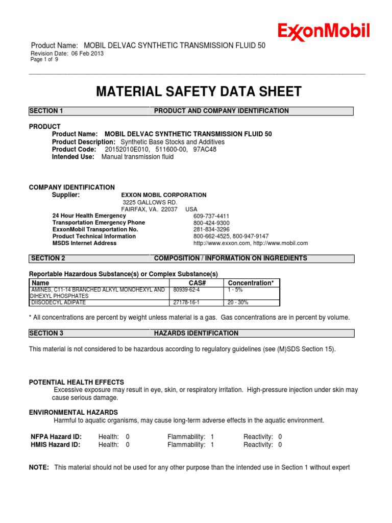 Material Safety Data Sheet Product Name Mobil Delvac Synthetic
